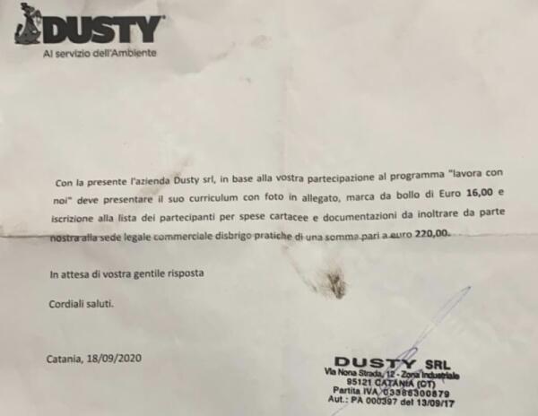 FALSA LETTERA PROMETTE ASSUNZIONI ALLA DUSTY