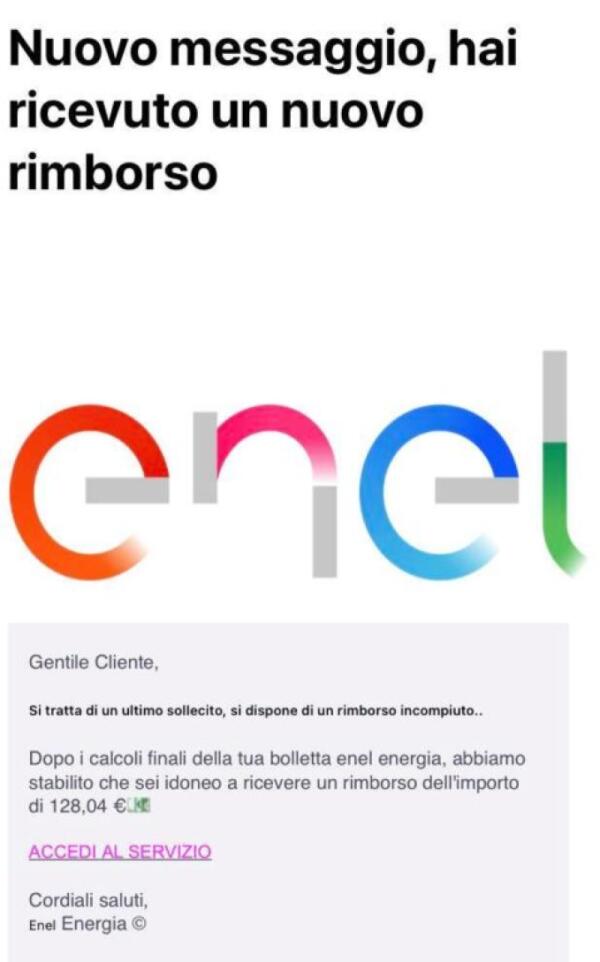 ATTENTI ALLA FALSA MAIL DELL’ENEL: PROMETTE UN RIMBORSO MA IN REALTÀ È UNA TRUFFA