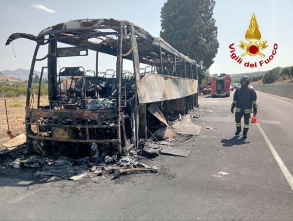 MINEO, AUTOBUS VA A FUOCO LUNGO LA STATALE: IL CONDUCENTE METTE IN SALVO I 19 PASSEGGERI