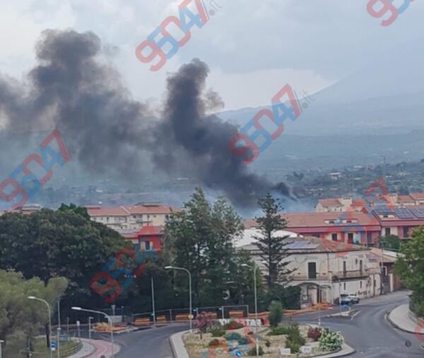 INCENDIO NEL TERRENO DI FRONTE A ETNAPOLIS: FIAMME ALTE E INTERVENTO DEI VIGILI DEL FUOCO