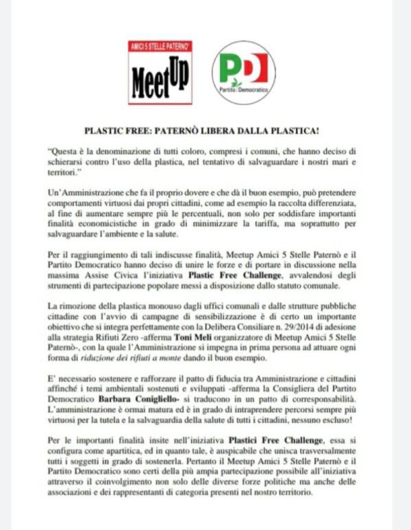 PLASTIC FREE: PATERNÒ LIBERA DALLA PLASTICA! COMUNICATO MEETUP AMICI M5S E PD