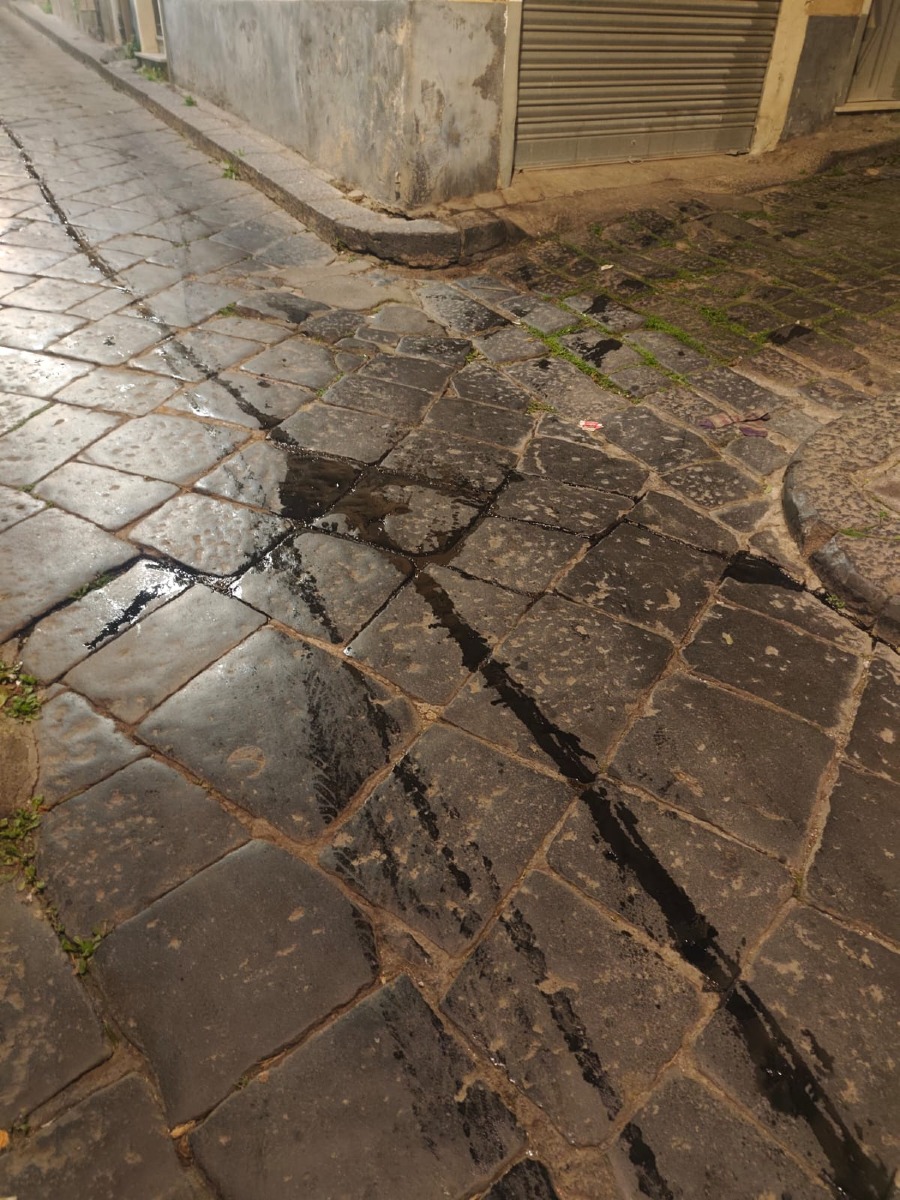 Secondo quanto riferito, la perdita sarebbe stata causata probabilmente da un mezzo in transito che avrebbe lasciato una evidente traccia scura sull’antico basolato in pietra lavica. La sostanza si estende per diversi metri e interessa anche un incrocio della zona.